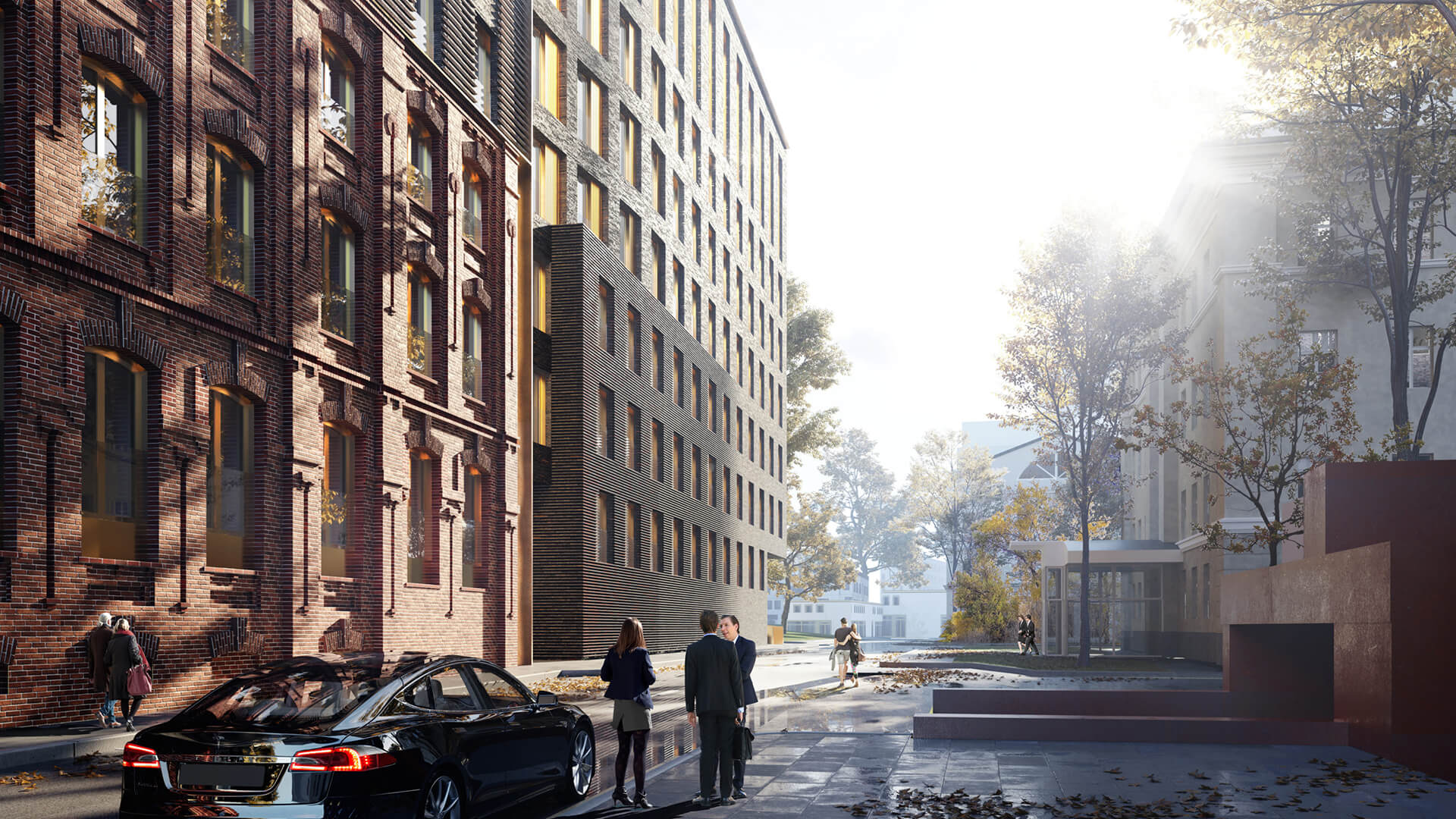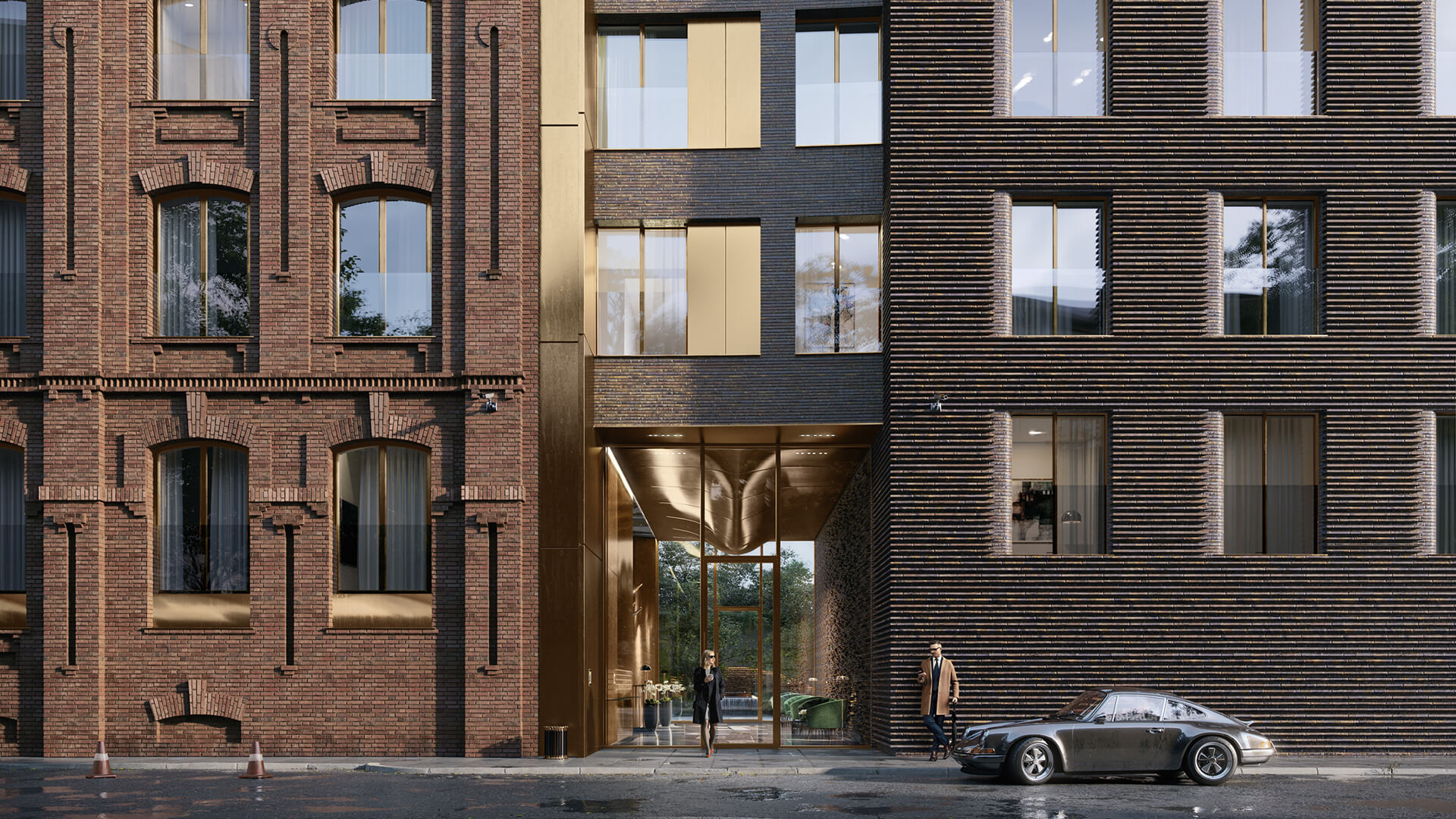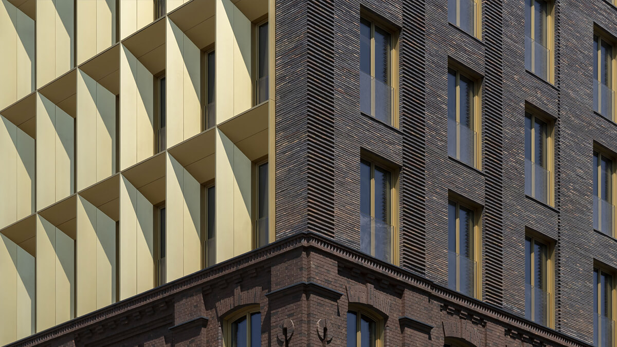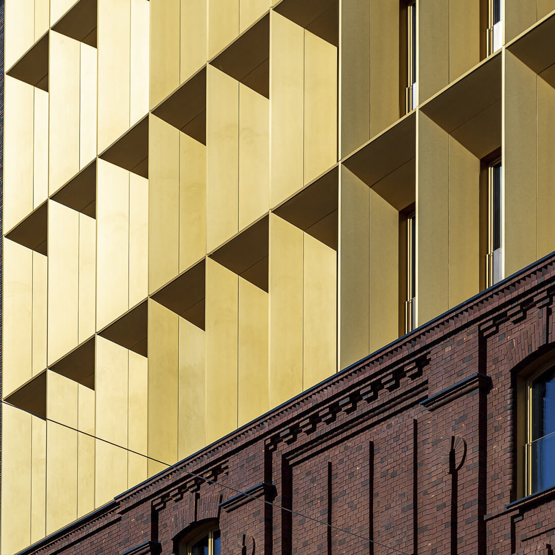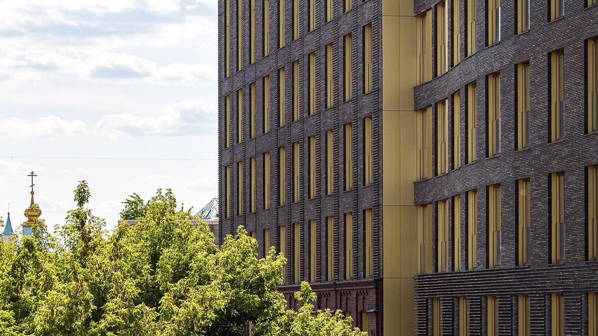 «Тессинский, 1» запоминается с первого взгляда благодаря панелям бронзового цвета, которыми облицован главный фасад. Бронза, менее яркая, чем золото, задает дому правильный тон скромной роскоши, а благородная патина со временем придаст зданию ощущение ценности вне времени.