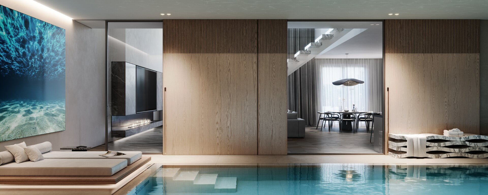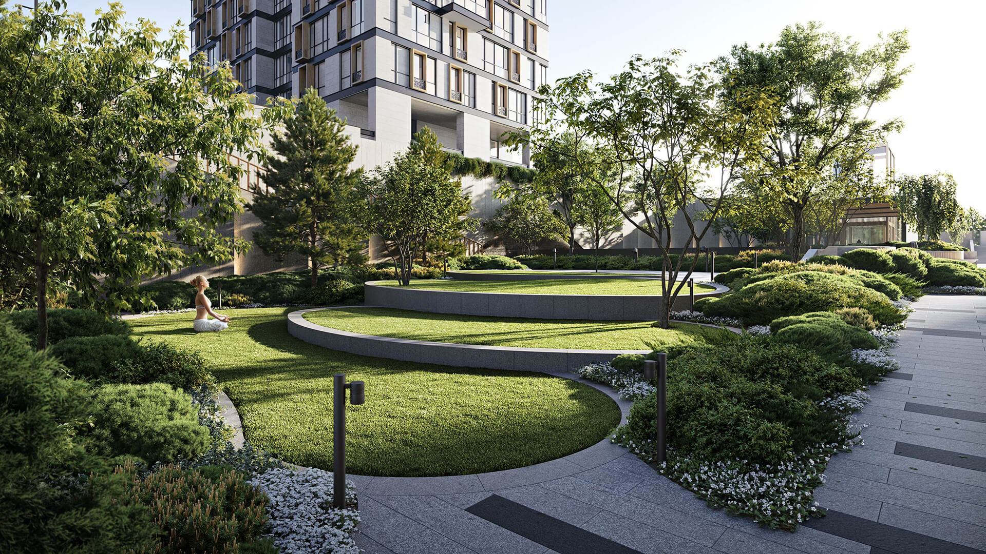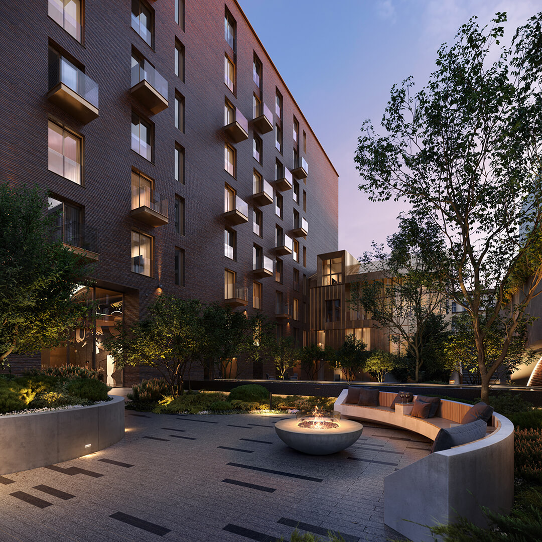 Внутренний двор - это миниатюрный оазис с изумрудным газоном под ногами. Он надежно скрыт от городского шума и чужих глаз. Центральным местом притяжения здесь является дизайнерский пруд, который создает атмосферу для спокойных размышлений. Мягкое ландшафтное освещение делает ночной сад особенно вдохновляющим и уютным. Тихий шум воды, пение птиц, шелест листвы - трудно поверить, что вы находитесь в самом центре Москвы XXI века.