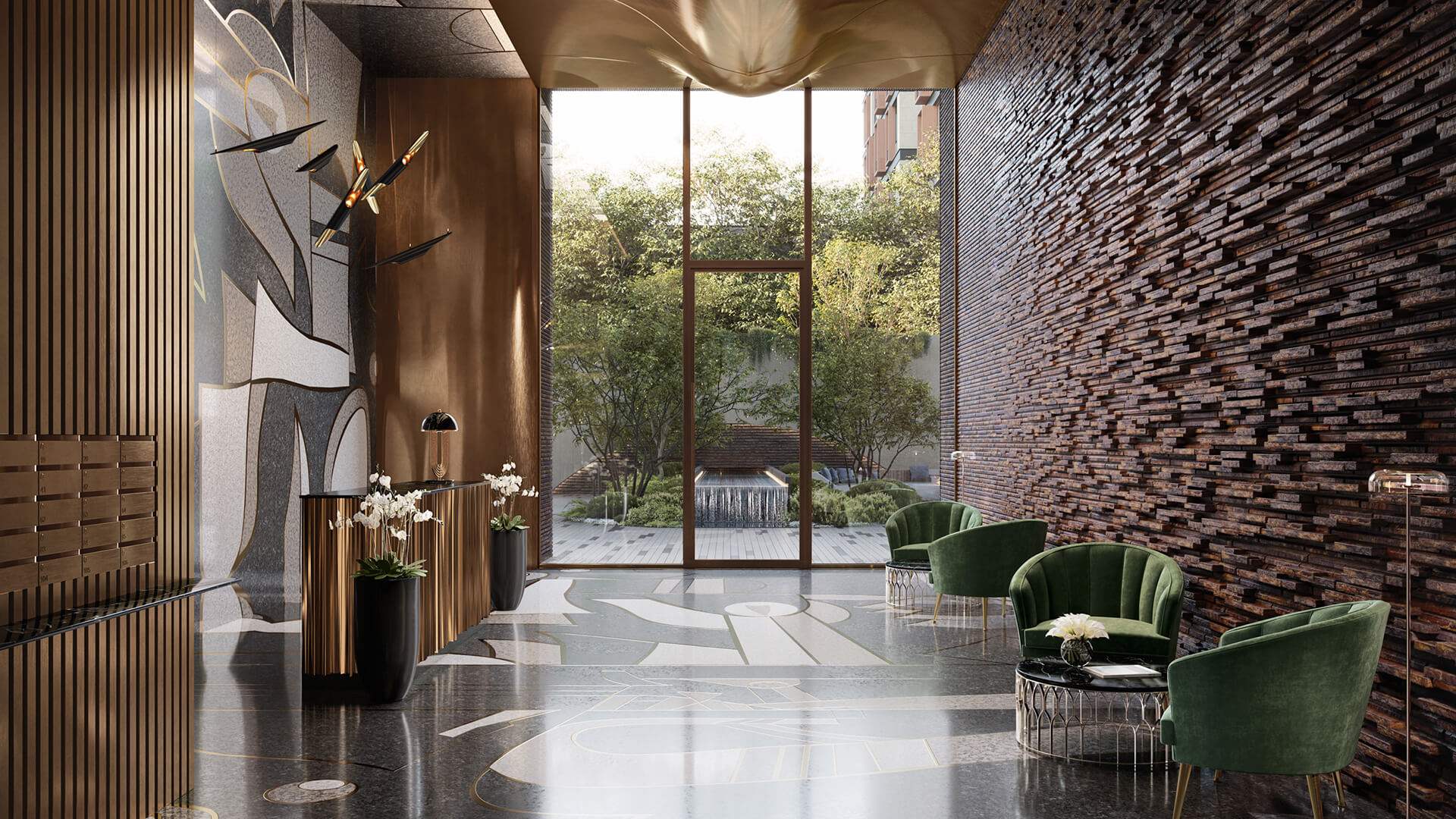 Дизайн общественных пространств дома «Тессинский, 1» сочетается с его внешним видом. Фасад отделан кирпичом ручной формовки, который продолжает использоваться в интерьере холла. Потолок и стены холла облицованы бронзой, которая также украшает оконные проемы. Время ожидания проходит незаметно в удобных мягких креслах.